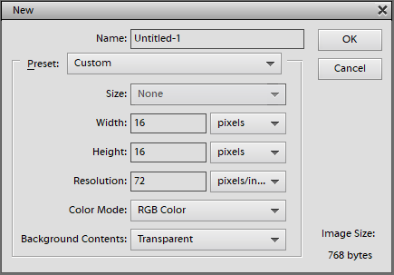 - चौड़ाई और ऊंचाई को किसी छोटी चीज़ पर सेट करें (मेरे मामले में मैं ग्राउंड टाइल बनाकर शुरुआत करूंगा, इसलिए चौड़ाई और ऊंचाई 16 पर सेट है)