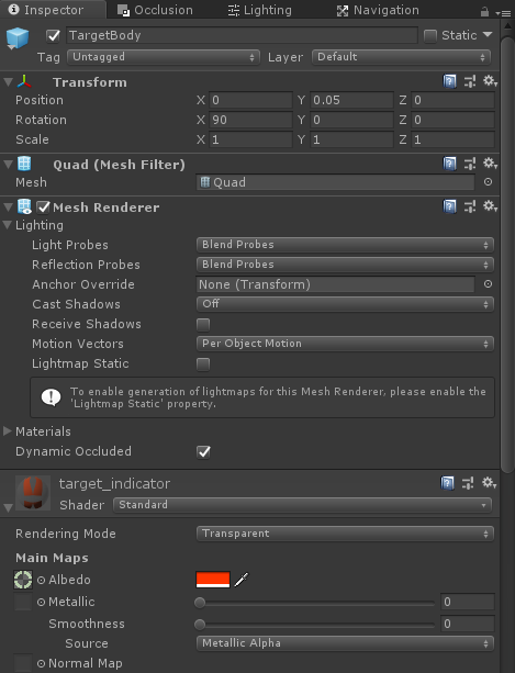 - अगला लक्ष्य संकेतक prefab बनाना है। यह क्वाड के साथ एक साधारण गेमऑब्जेक्ट है जो इंगित करेगा कि हमने मानचित्र पर कहां क्लिक किया है।