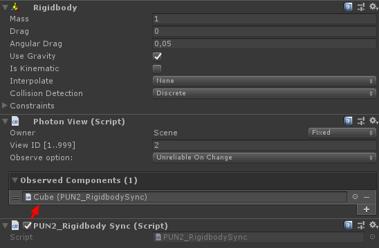 }- दोनों क्यूब्स में PUN2_RigidbodySync संलग्न करें और इसे फोटॉन व्यू "Observed Components" पर भी असाइन करें: