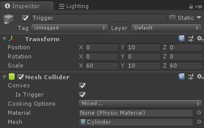 - "Trigger" गेमऑब्जेक्ट में मेशकोलाइडर घटक जोड़ें, Convex और IsTrigger चेकबॉक्स की जांच करें, और इसके मेश को डिफ़ॉल्ट सिलेंडर में बदलें